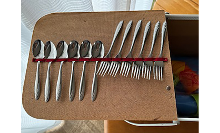 ミニテーブル、シルバーウェア(フォーク、スプーン各6本ずつ)、